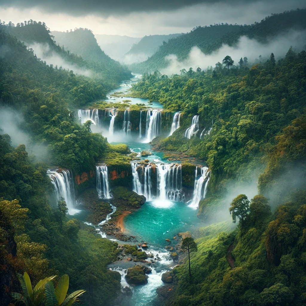 Breathtaking waterfalls, showcasing the lush greenery and misty atmosphere that make it a true “Land of Living Waterfalls.