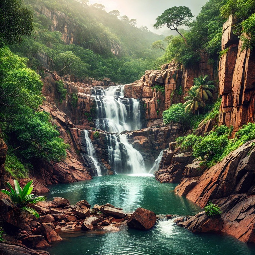 “A serene waterfall near Puducherry, surrounded by lush greenery—perfect for a refreshing getaway!”