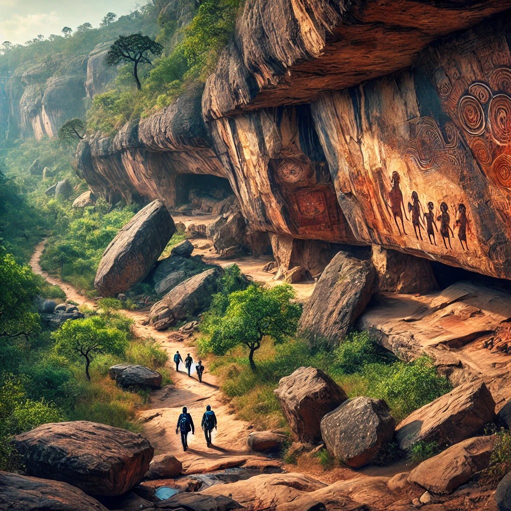 Here is an image of the Bhimbetka Rock Shelters trek, showcasing the ancient cave paintings and the scenic landscape. Let me know if you’d like any modifications!