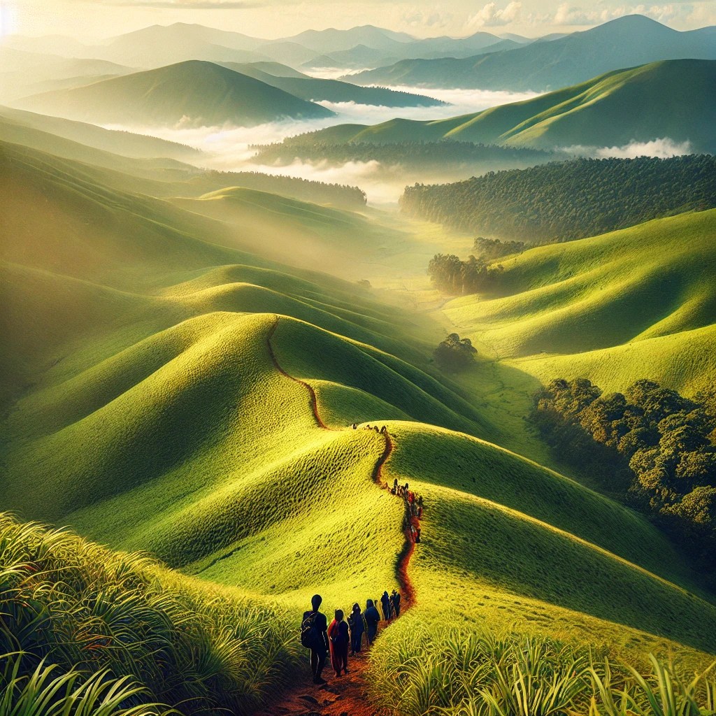A breathtaking view of the Kudremukh Trek, showcasing rolling green grasslands, misty peaks, and adventurous trekkers along the scenic trail.