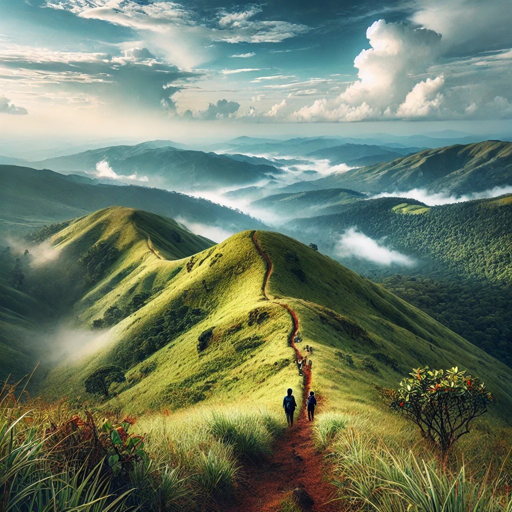 A breathtaking view of the Tadiandamol Trek, showcasing misty peaks, lush green grasslands, and an adventurous trail through the Western Ghats.