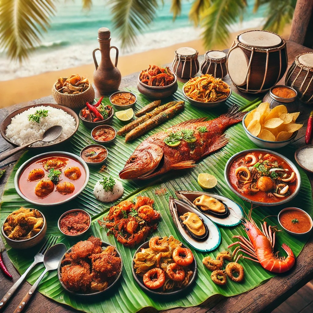 Vibrant Kerala seafood feast, capturing the coastal flavors and traditional presentation