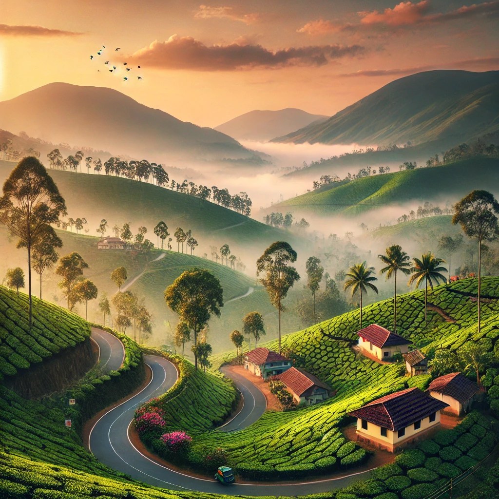 A serene hill station in Kerala, featuring mist-covered mountains, lush tea plantations, and winding roads under a golden sunrise.