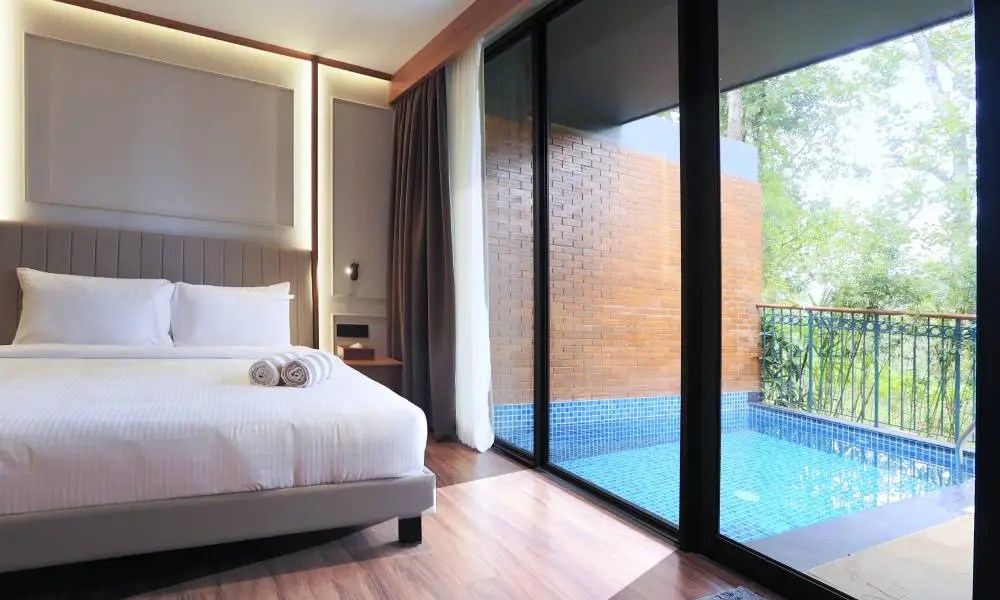 - Luxury Suite with Private Pool – Spacious room, private pool, scenic balcony, living area, and elegant amenities.