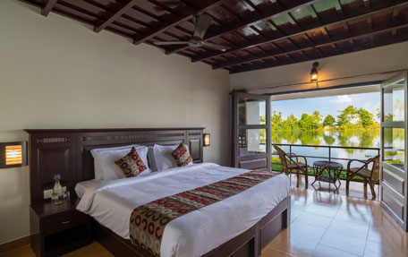 Perched along the banks of Vembanad Lake, the Lake View Cottages provide uninterrupted views of the water. These spacious rooms include private outdoor seating areas, ideal for couples or families to sip coffee while watching the sun dip behind the horizon. The romantic setting and natural beauty make these cottages highly sought after.